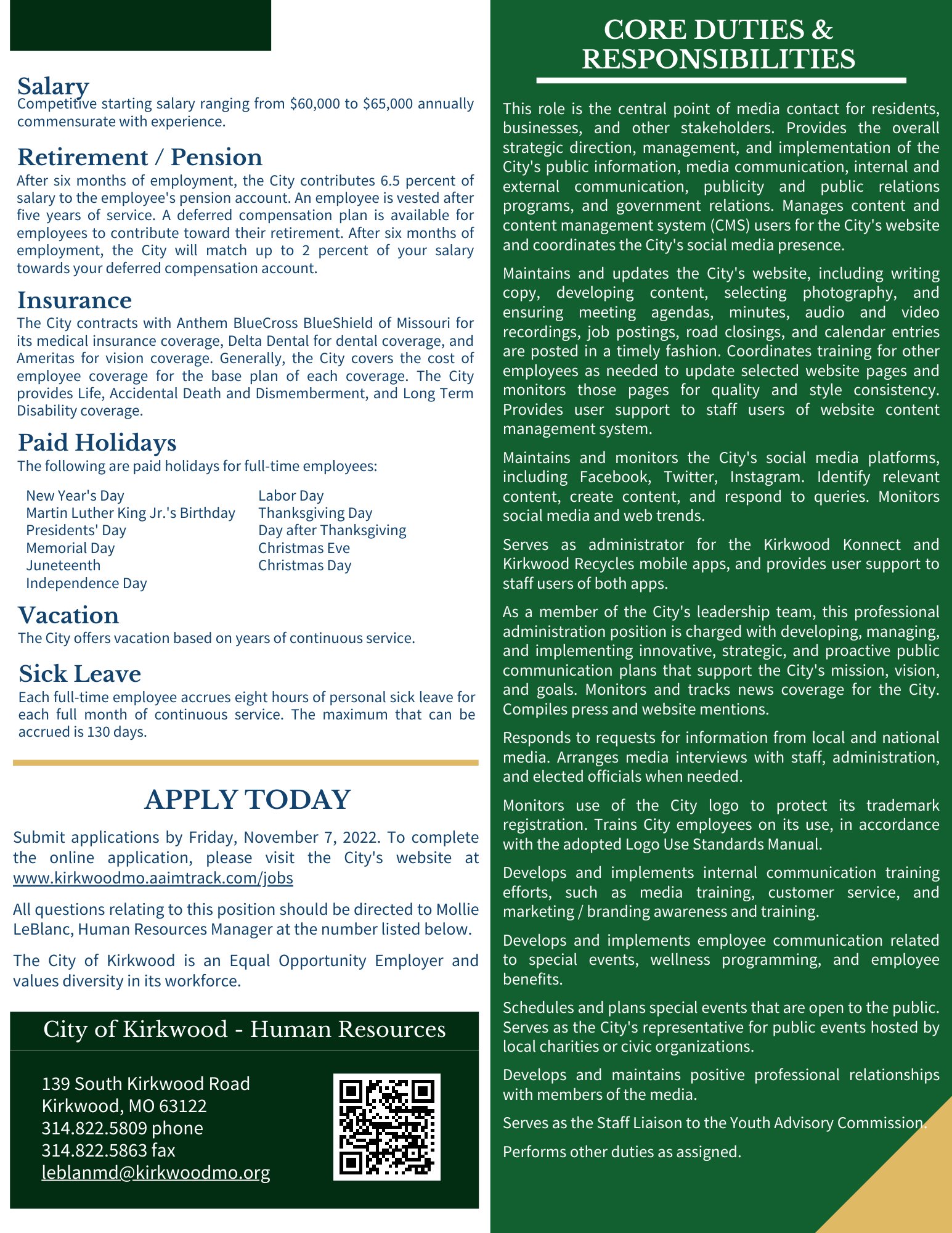 Apply for a City of Kirkwood Performing Arts Center General Manager job in Saint Louis MO. Return paper applications to.